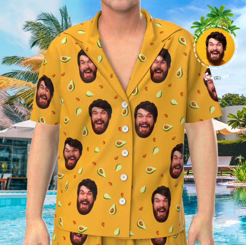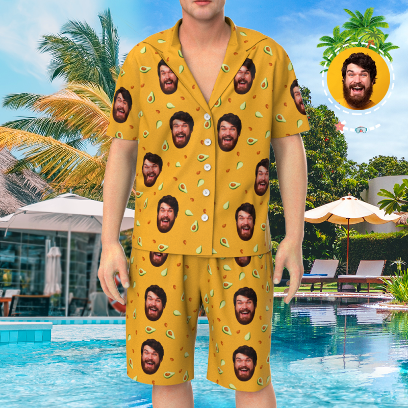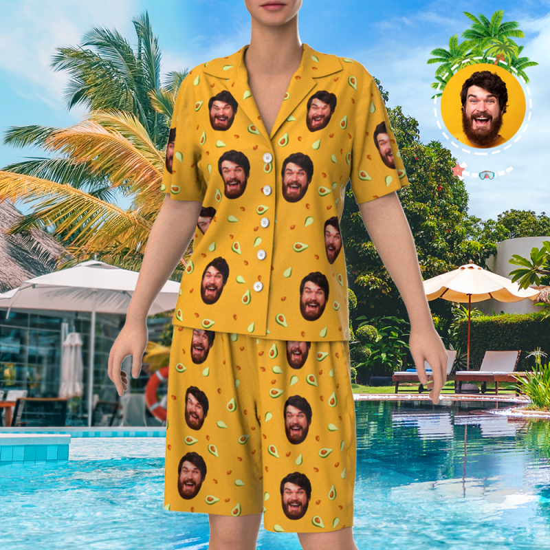 Conjunto De Pijama Con Cara Personalizada, Ropa De Dormir De Manga Corta, Ropa De Dormir Con Botones - Aguacate