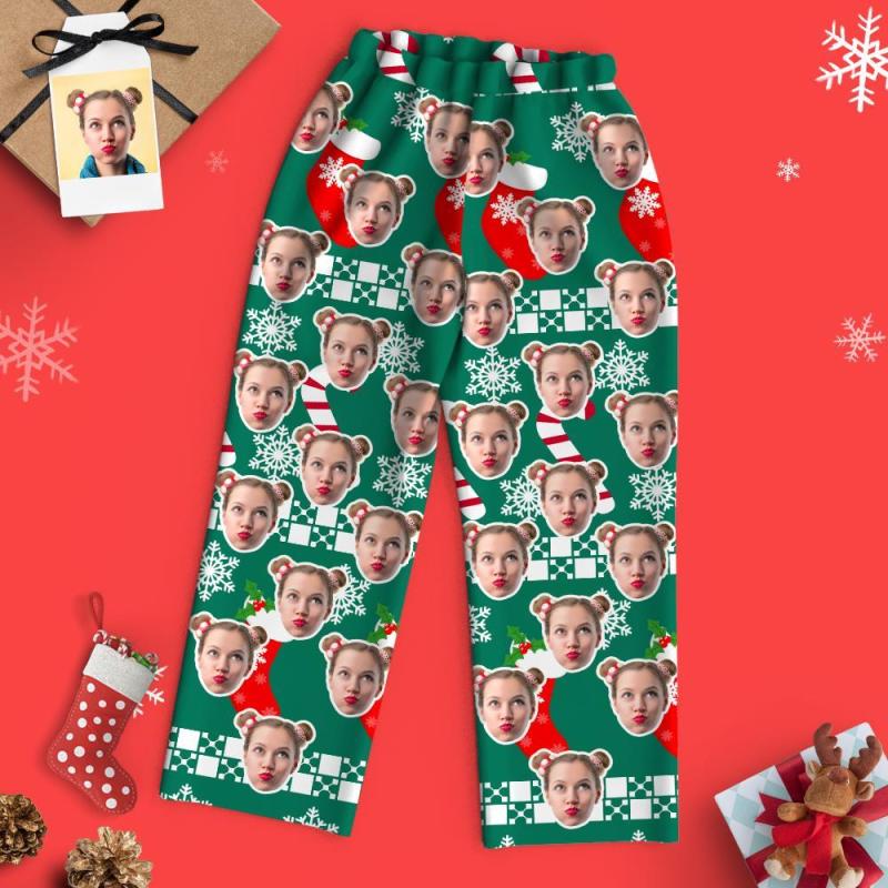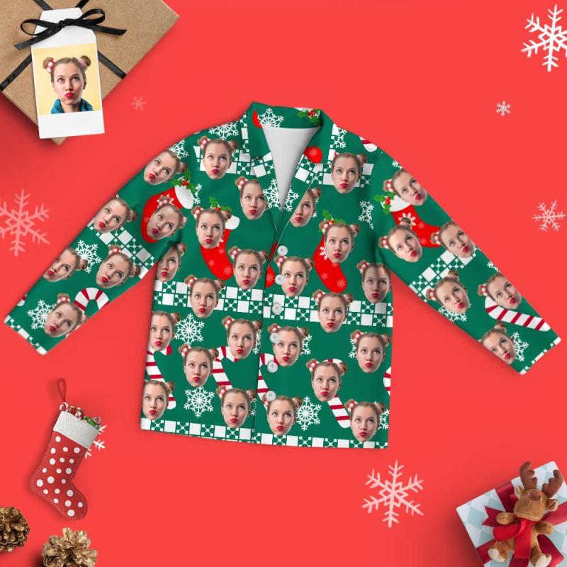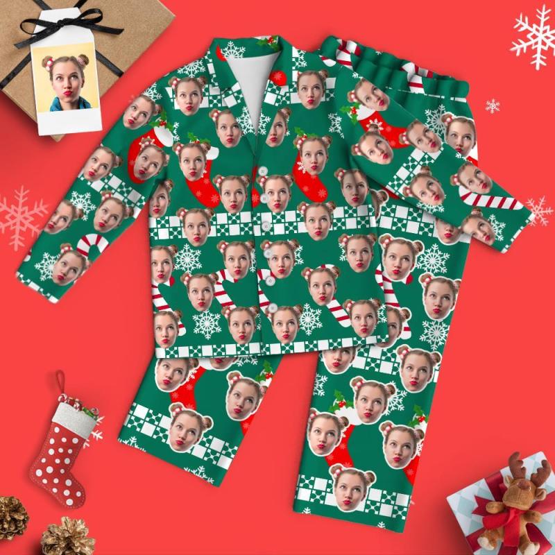 Pijama de Navidad de manga larga con cara personalizada - Media de Navidad verde
