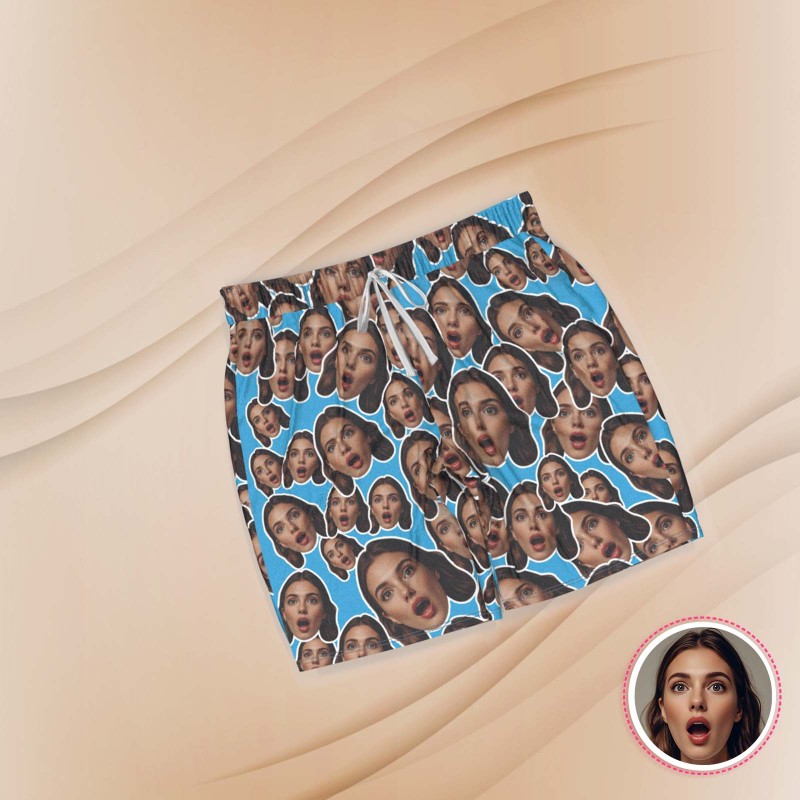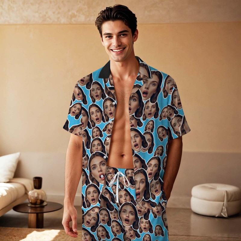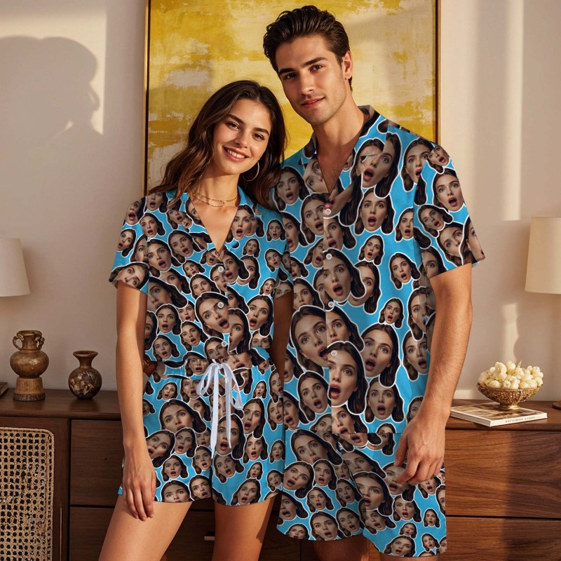 Pijamas De Manga Corta Con Cara Personalizada, Ropa De Dormir Azul Personalizada, Regalos De Amor