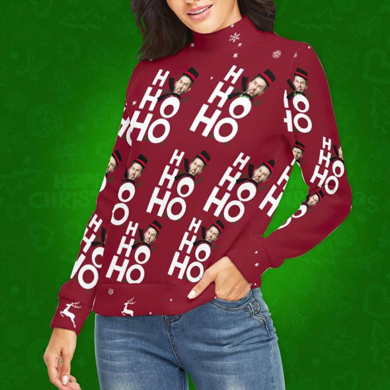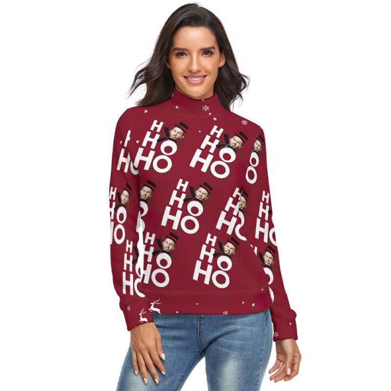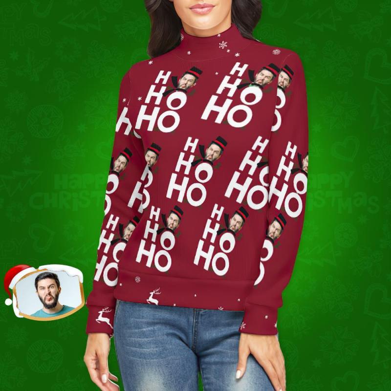 Jersey De Cuello Alto Con Cara Personalizada Para Mujer Suéter Feo De Navidad Suéteres Sueltos De Punto - Ho Ho Ho