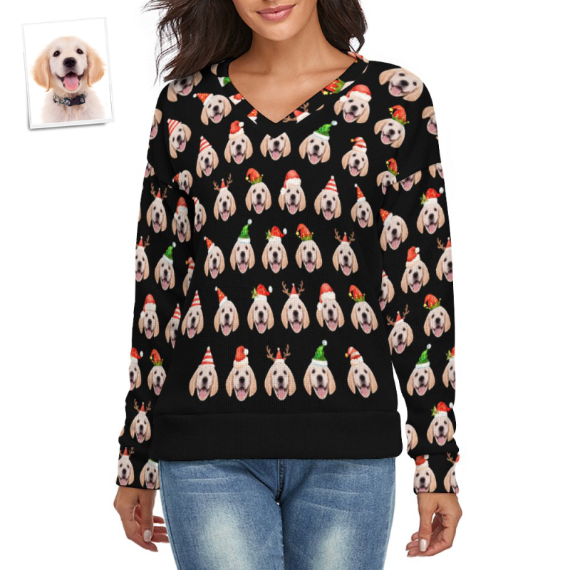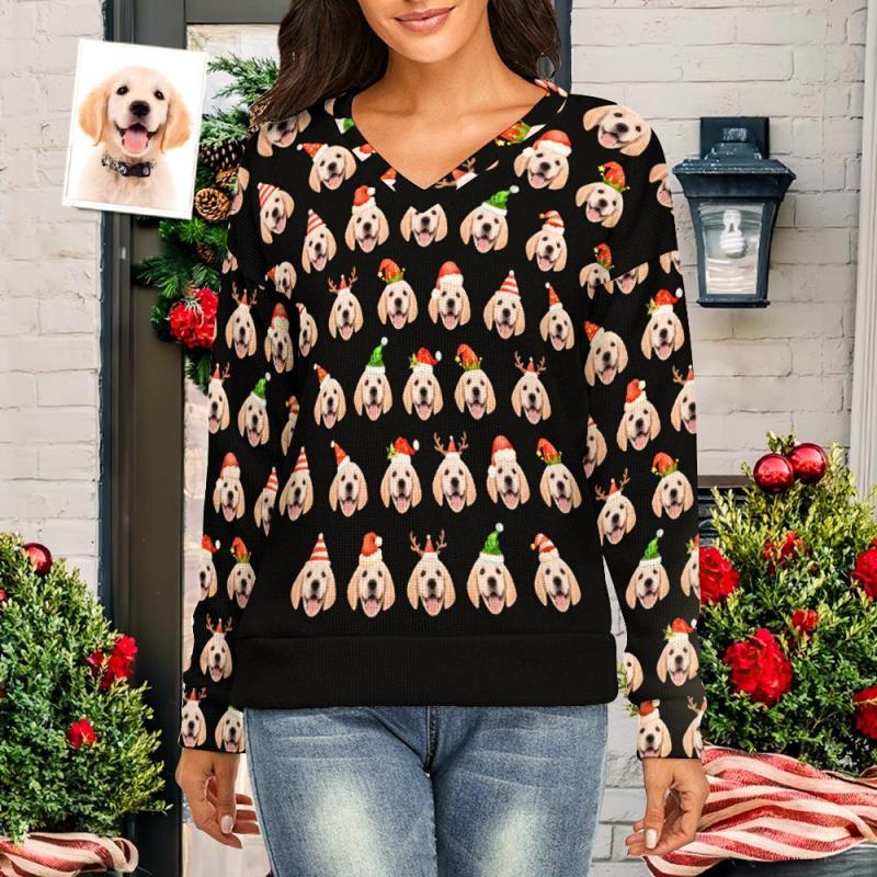 Cara Personalizada Mujer Cuello En V Navidad Mascota Tema Suéter Spandex Cómodo