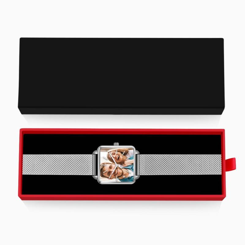 Reloj de pareja personalizado Reloj de foto grabada - Reloj de caja cuadrada plateada